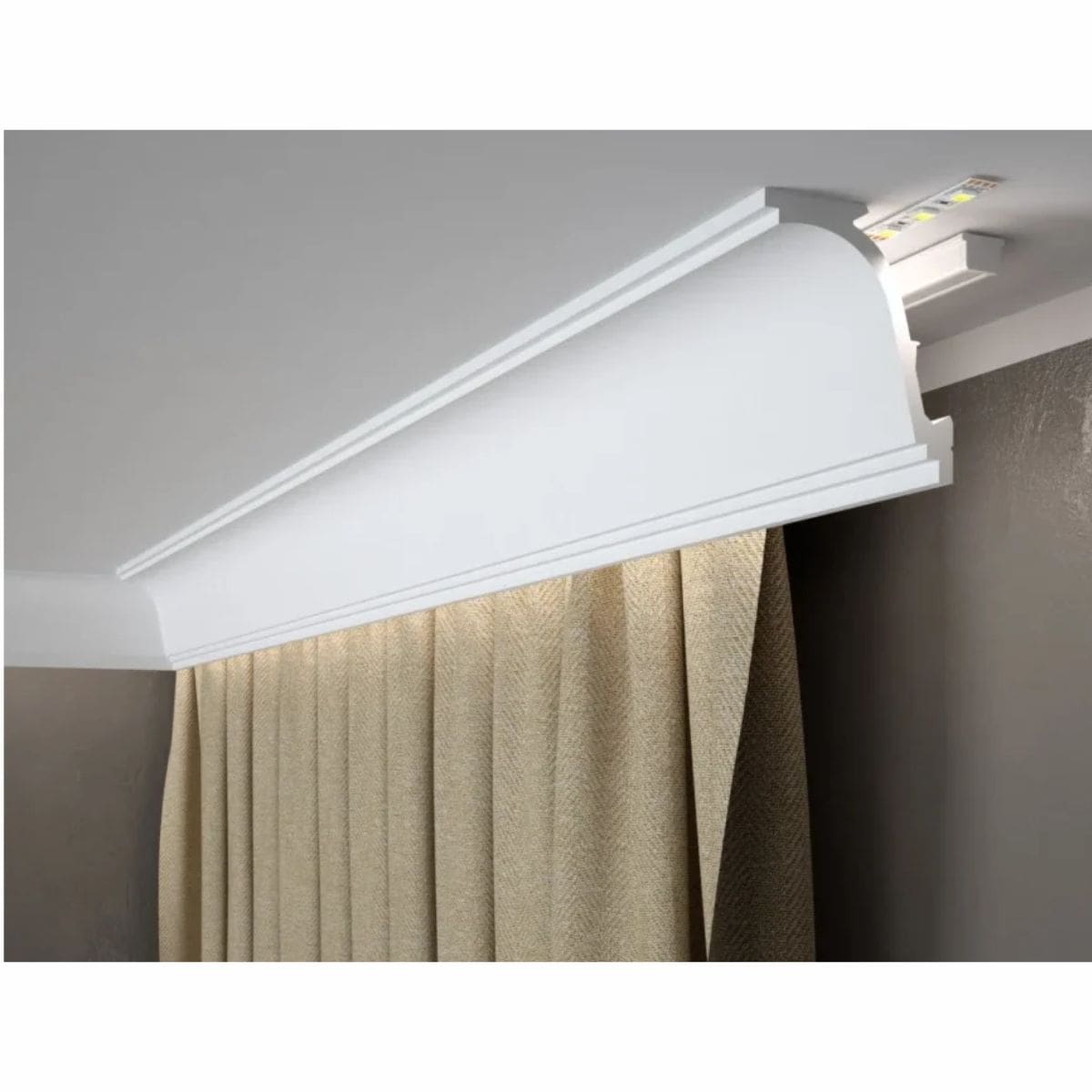Es un cortinero tipo media caña, muy utilizado para acabados decorativos clásicos.