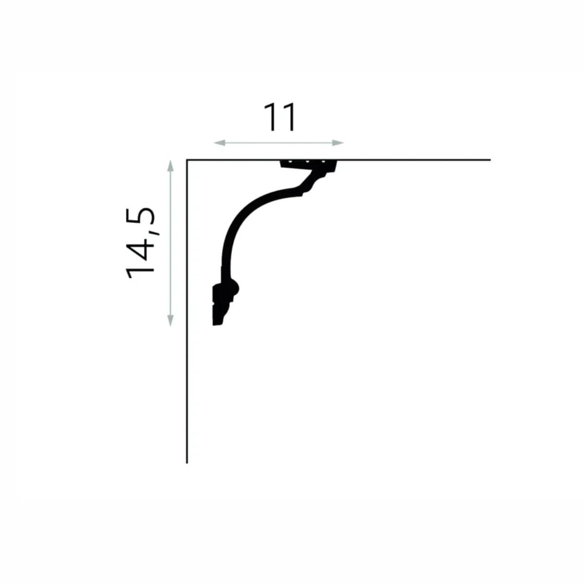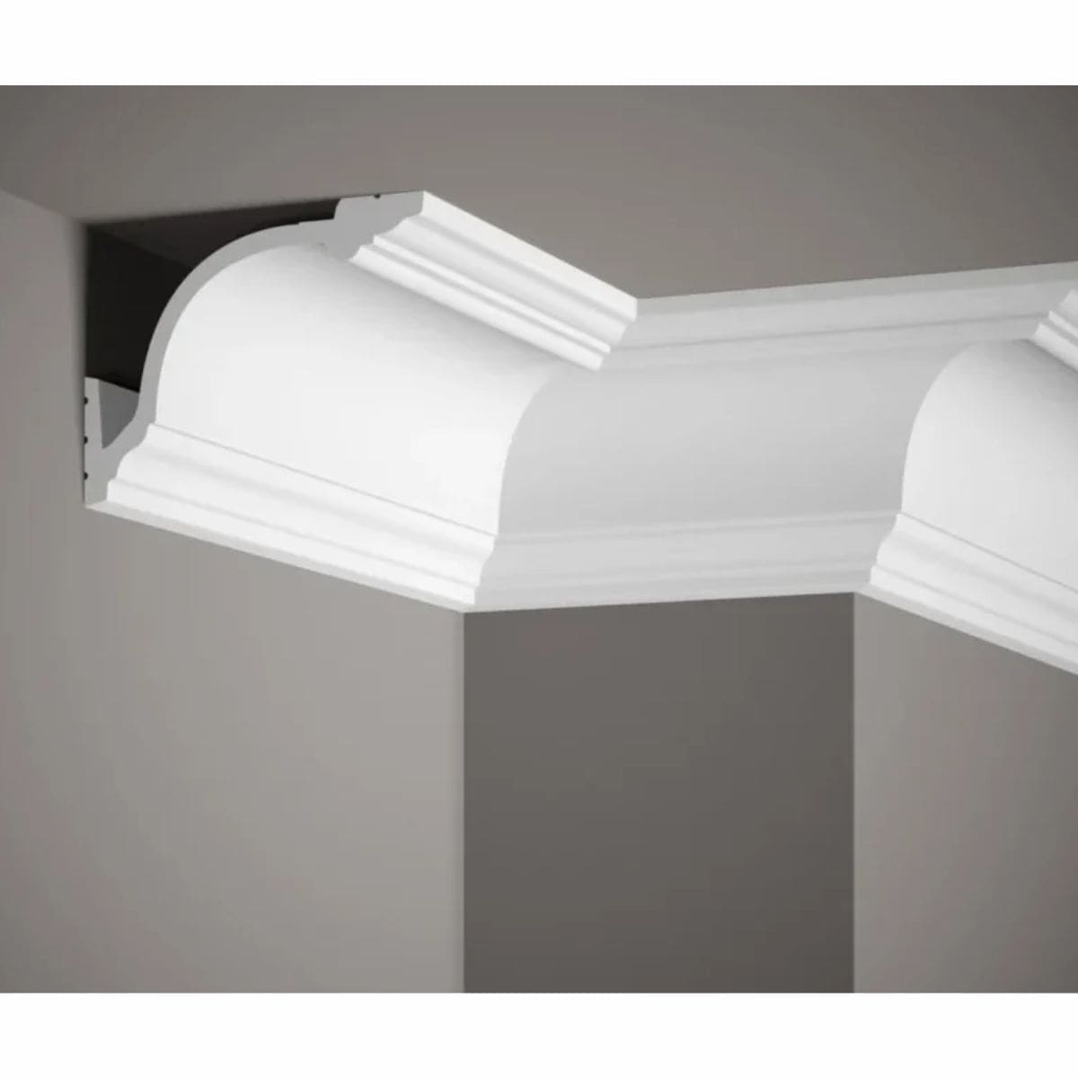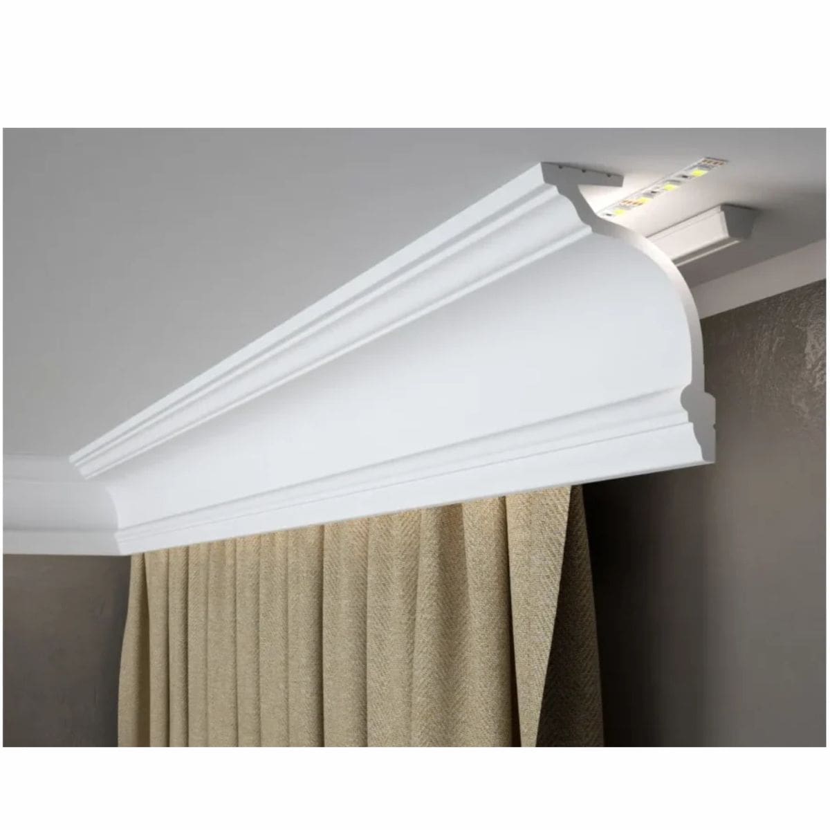 El cortinero Roma MD156 es un perfil decorativo de gran formato diseñado para ocultar rieles o barras de cortinas, aportando un acabado limpio y elegante en la unión entre pared y techo.