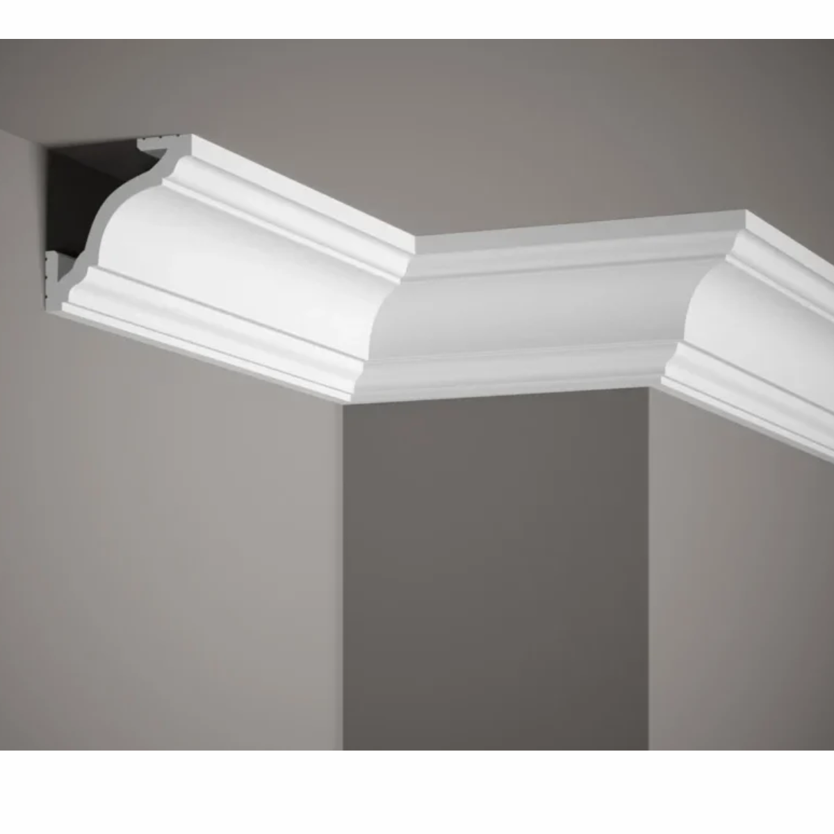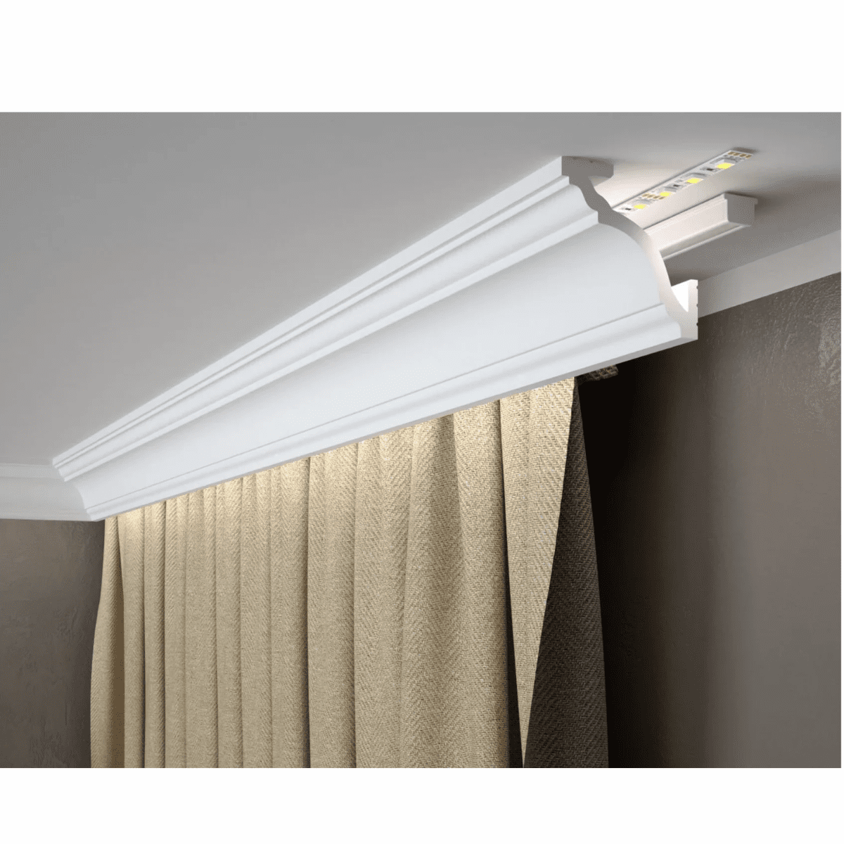 El cortinero MD213 de Mardom Decor es una solución decorativa diseñada para ocultar rieles o barras de cortinas, creando un acabado limpio y moderno en la unión entre pared y techo.