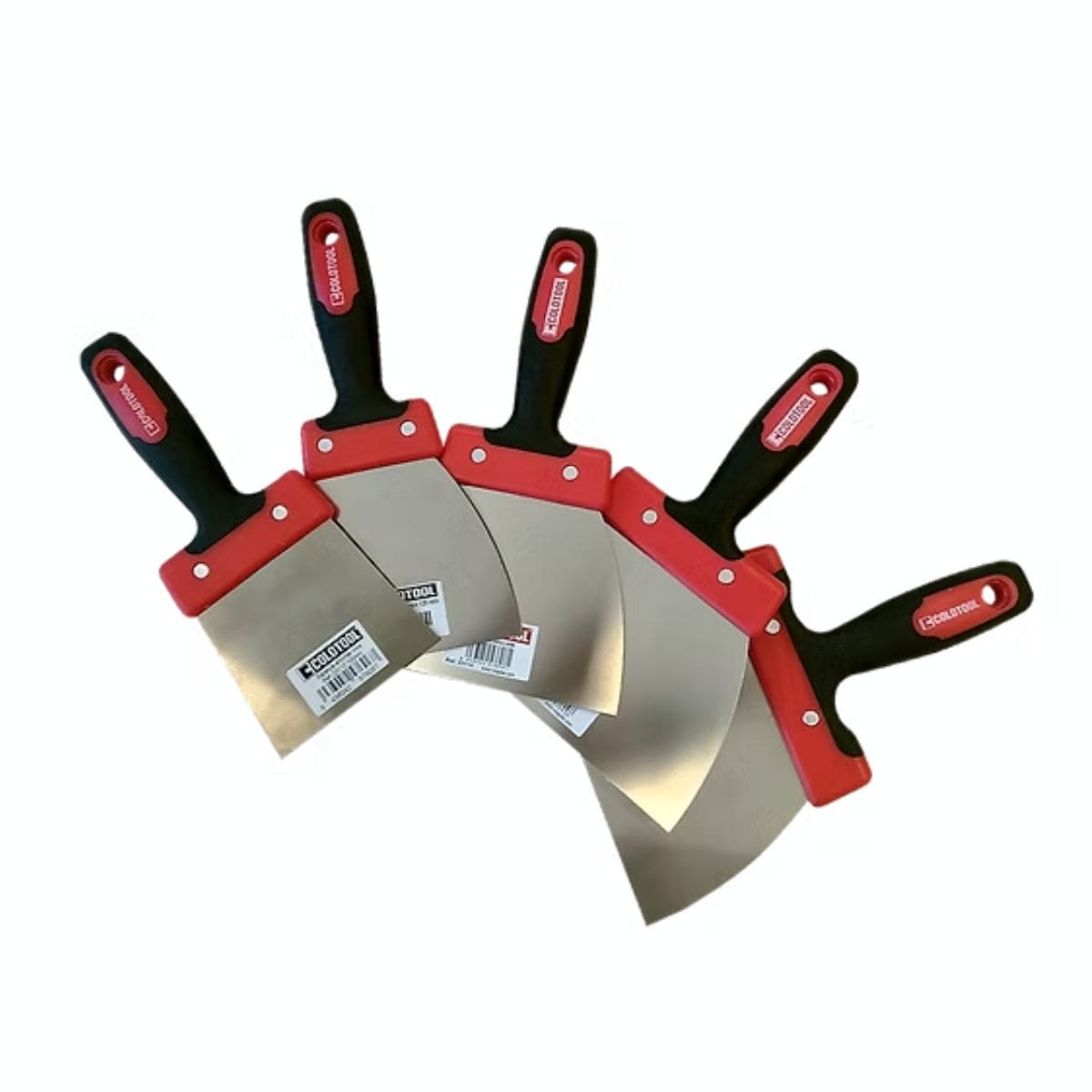 Espátulas americanas profesionales para encintado de sistemas drywall y placa de yeso, con mango bimaterial ergonómico y hoja flexible de alta calidad. Disponibles en pack completo o unidades sueltas por medida, ideales para juntas, cargado de pasta y acabado fino.