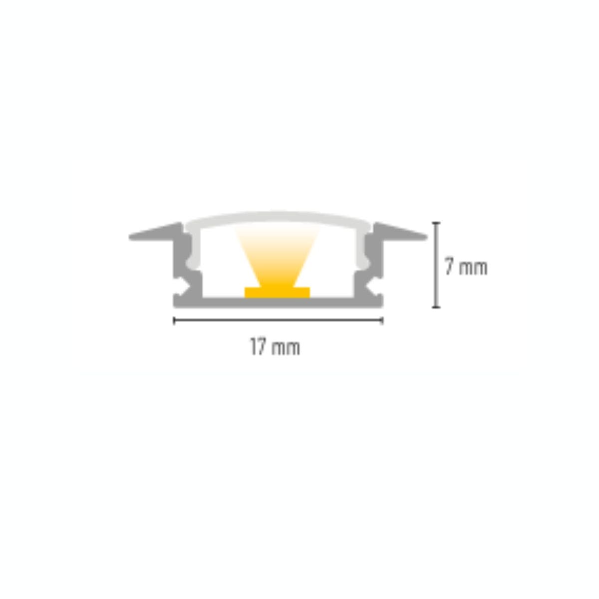Perfil LED decorativo para placas de yeso laminado. Medida 7×17 mm, acabado plata mate anodizado. Longitud 2,60 m. Caja de 20 unidades. No incluye tira LED.