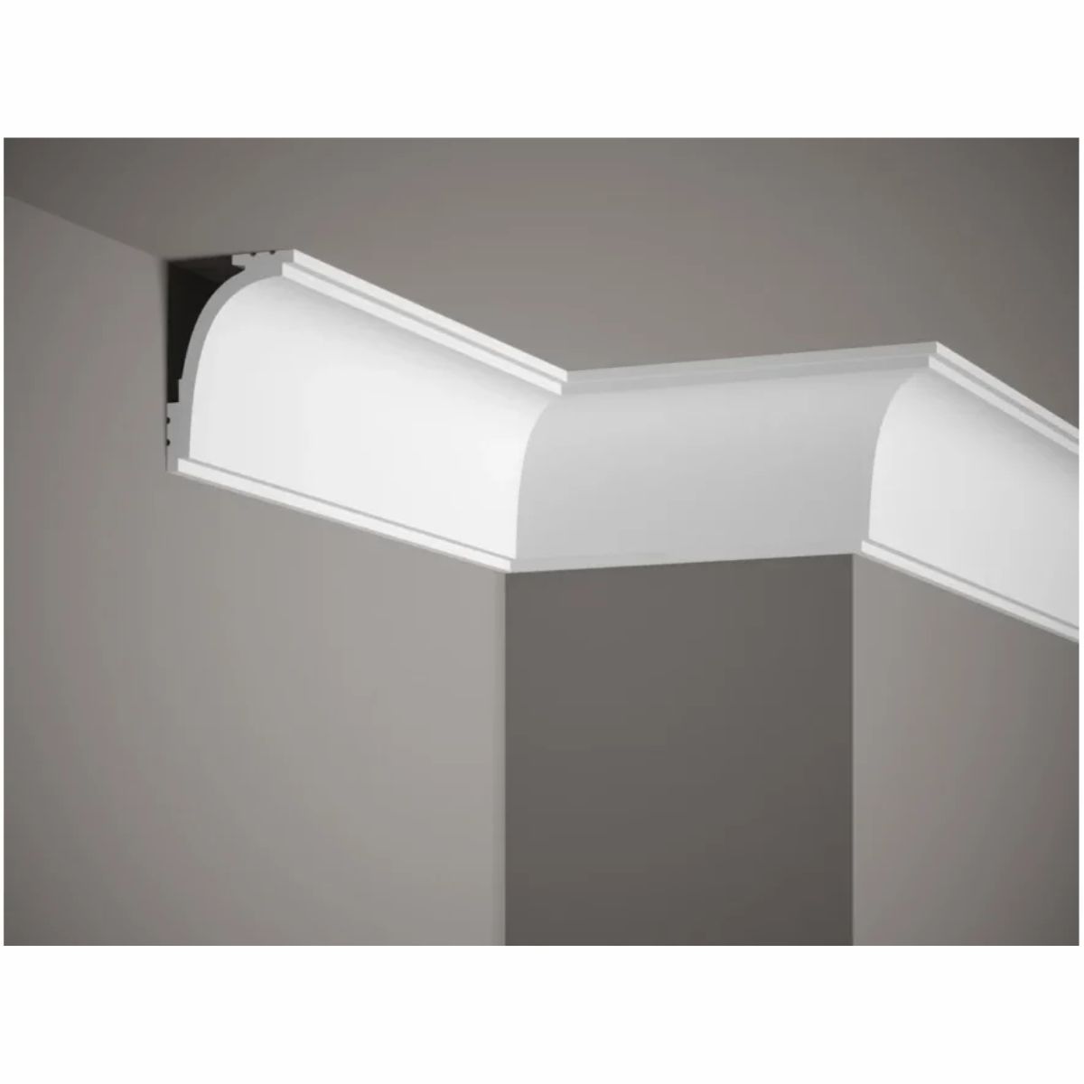 Es una moldura de techo tipo media caña grande, diseñada para rematar la unión entre pared y techo con un acabado limpio y decorativo.