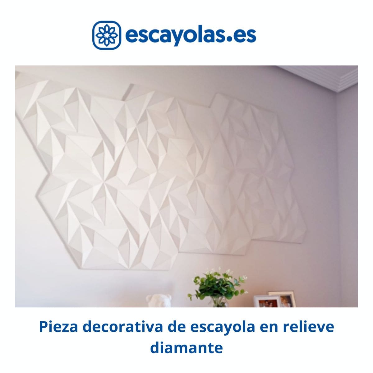 La pieza relieve diamante en escayola es un elemento decorativo que aporta volumen y sofisticación a las paredes. Con un diseño facetado inspirado en las formas de un diamante tallado, crea un mural moderno y elegante, ideal para interiores contemporáneos.