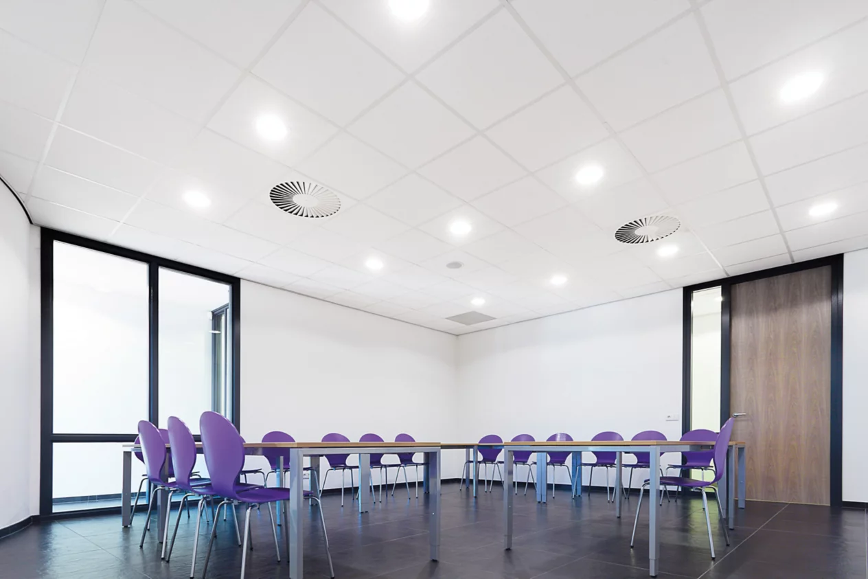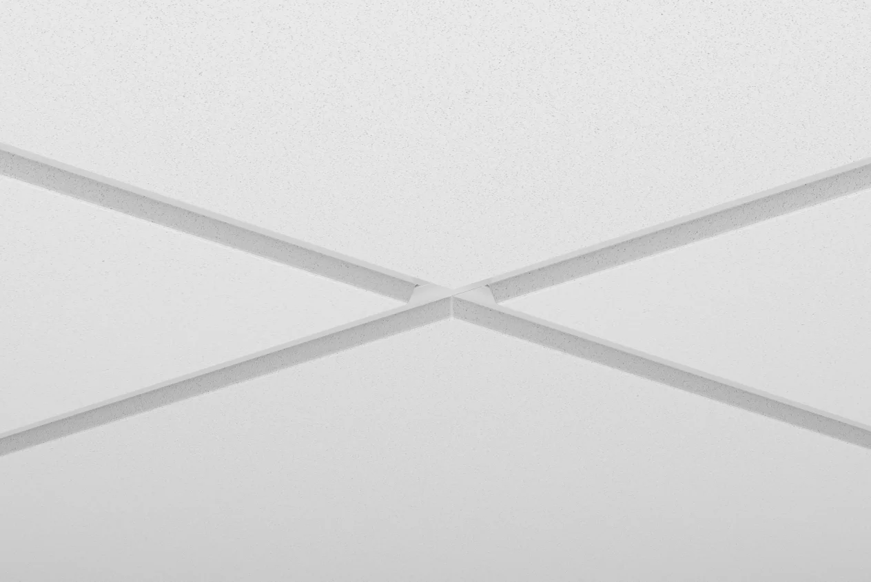 Placa mineral laminada acústica de 13 mm en blanco de alta reflectancia (86 %) con buena absorción sonora (αw = 0,70), ideal para techos en oficinas, comercios y salas de reuniones.