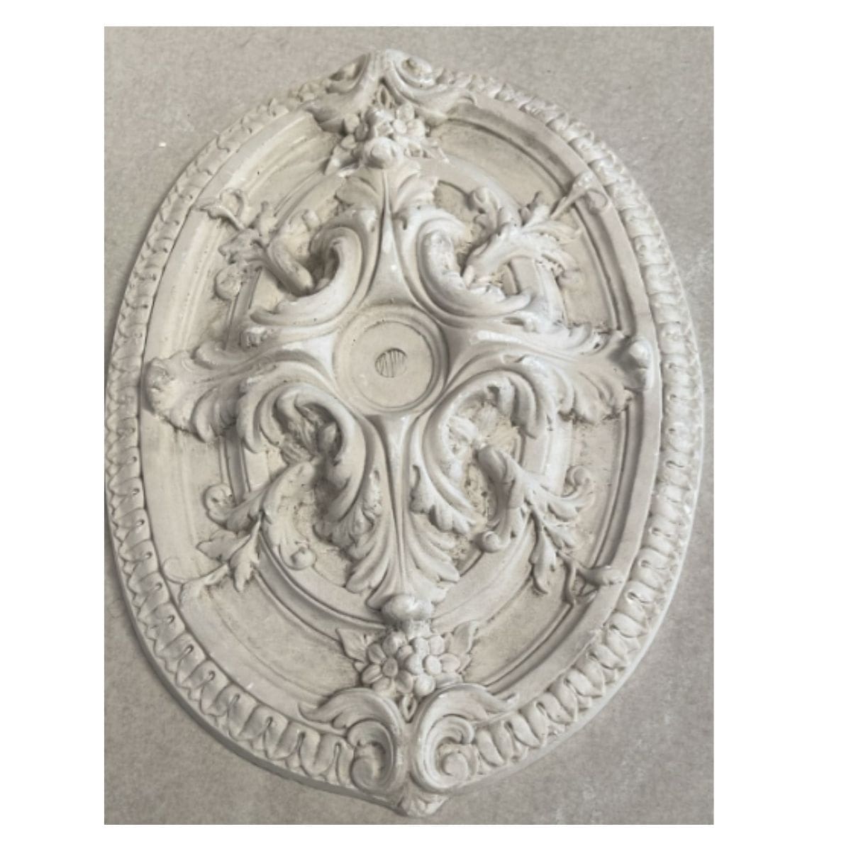 Plafón ovalado de escayola de 50×34 cm, con relieves florales y acabado clásico. Ideal para decorar techos y resaltar lámparas o centros de sala.