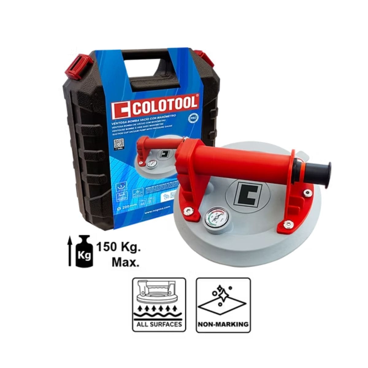 La ventosa con bomba de vacío y manómetro Colotool es una herramienta profesional diseñada para la elevación, manipulación y posicionamiento de materiales planos y lisos, como losas, cristales, paneles cerámicos y superficies pulidas. Su sistema de vacío con manómetro permite un agarre seguro y controlado, reduciendo riesgos de deslizamiento y mejorando la eficiencia en obra o taller.